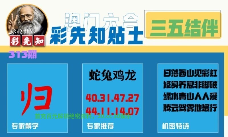 315期:彩先知贴士一字:【凭】 诗句:三阳开泰 机密特诗:狭路相逢路不通,回头已是白头翁,千山万水都走遍,一日千里四蹄踩 解:回头已是白头翁,解白肖:鼠牛虎鸡狗猪,千山万水都走遍,解水肖:鼠猪 九肖:鼠牛虎鸡狗猪猴蛇马 七肖:鼠牛虎鸡狗猪猴 五肖:鼠牛虎鸡狗 三肖:鼠牛虎 |