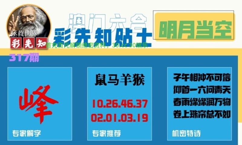 317期:彩先知贴士一字:【峰】 诗句:明月当空 机密特诗:子午相冲不可信,仰首一六问青天,春雨绵绵润万物,卷上珠帘总不如 解:仰首一六问青天,解天肖:兔牛猪猴马龙,春雨绵绵润万物,解春肖:兔虎龙 九肖:兔牛猪猴马龙虎蛇鼠 |